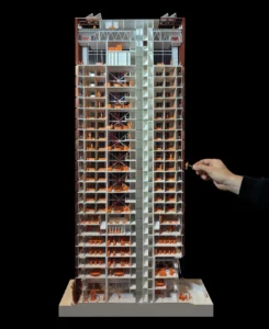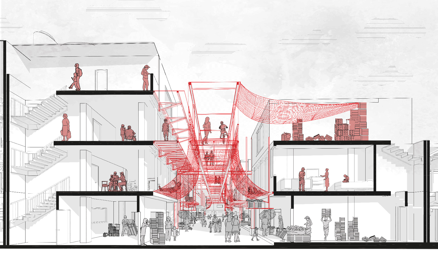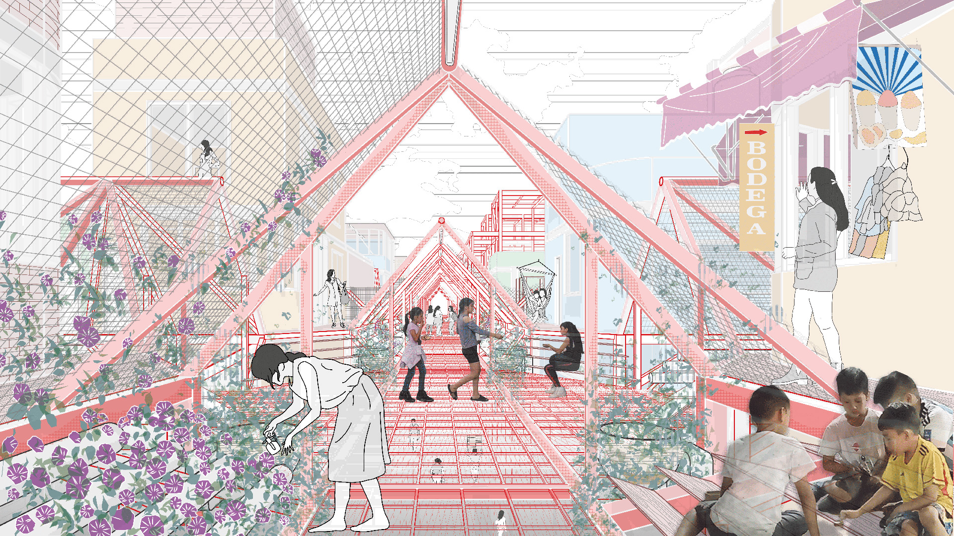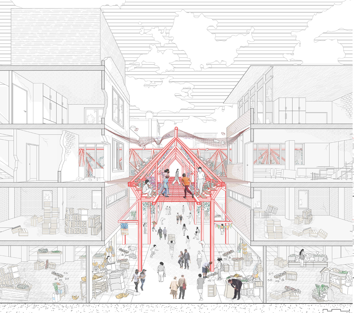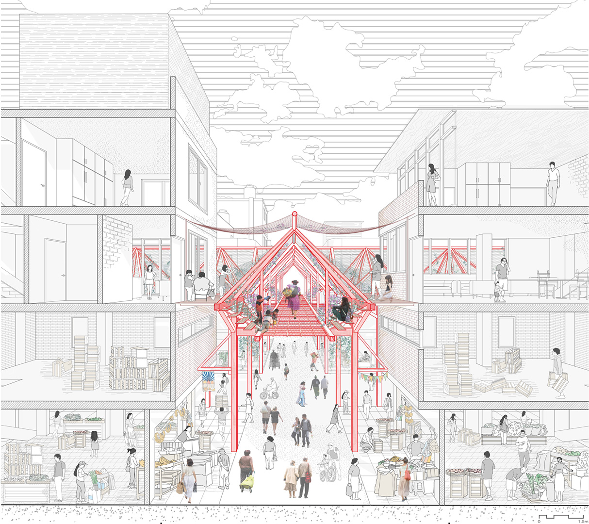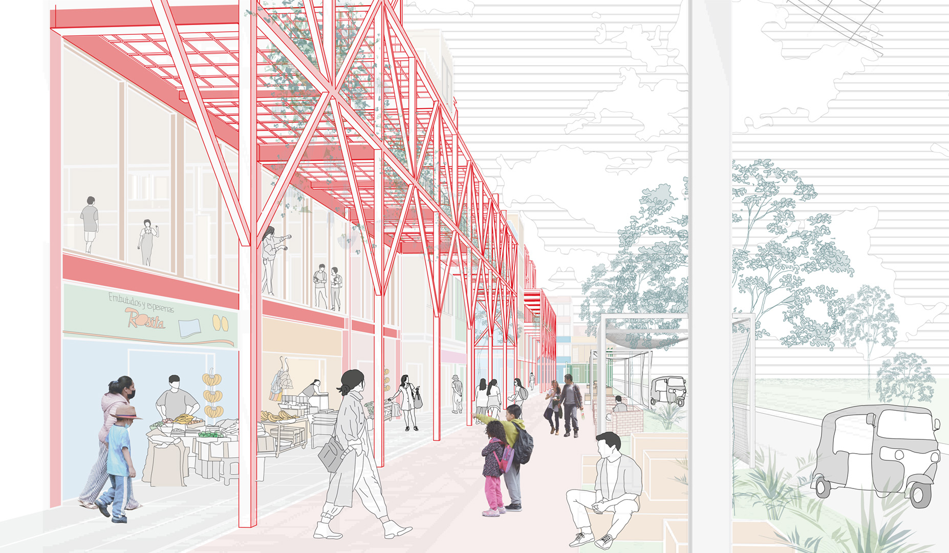El planteamiento comienza con un proceso participativo en el que intervienen madres, niños, autoridades del mercado y propietarios y constructores de ferreterías locales. Se identificaron las zonas donde confluyen con mayor intensidad las actividades de venta, residenciales, recreativas y de cuidado; paradójicamente, estas zonas concentran el mayor nivel de riesgo y amenazan la seguridad física de los distintos usuarios. Aquí es donde se localiza el primer tipo de «módulos asistenciales», cuya replicabilidad constituirá la base del nuevo sistema de pasarelas elevadas seguras. La segunda tipología modular es una exoestructura que refuerza los edificios con mayor riesgo de derrumbe debido a la actividad sísmica; esto permite completar el perfil urbano, posibilitando la integración de espacios dedicados a guarderías, apoyo educativo, actividades culturales, talleres de formación y servicios comunitarios. Estos nuevos centros, además de fomentar la interacción social y fortalecer los lazos comunitarios, refuerzan el papel de las madres y cuidadoras locales, generando oportunidades de desarrollo e ingresos adicionales para la comunidad.