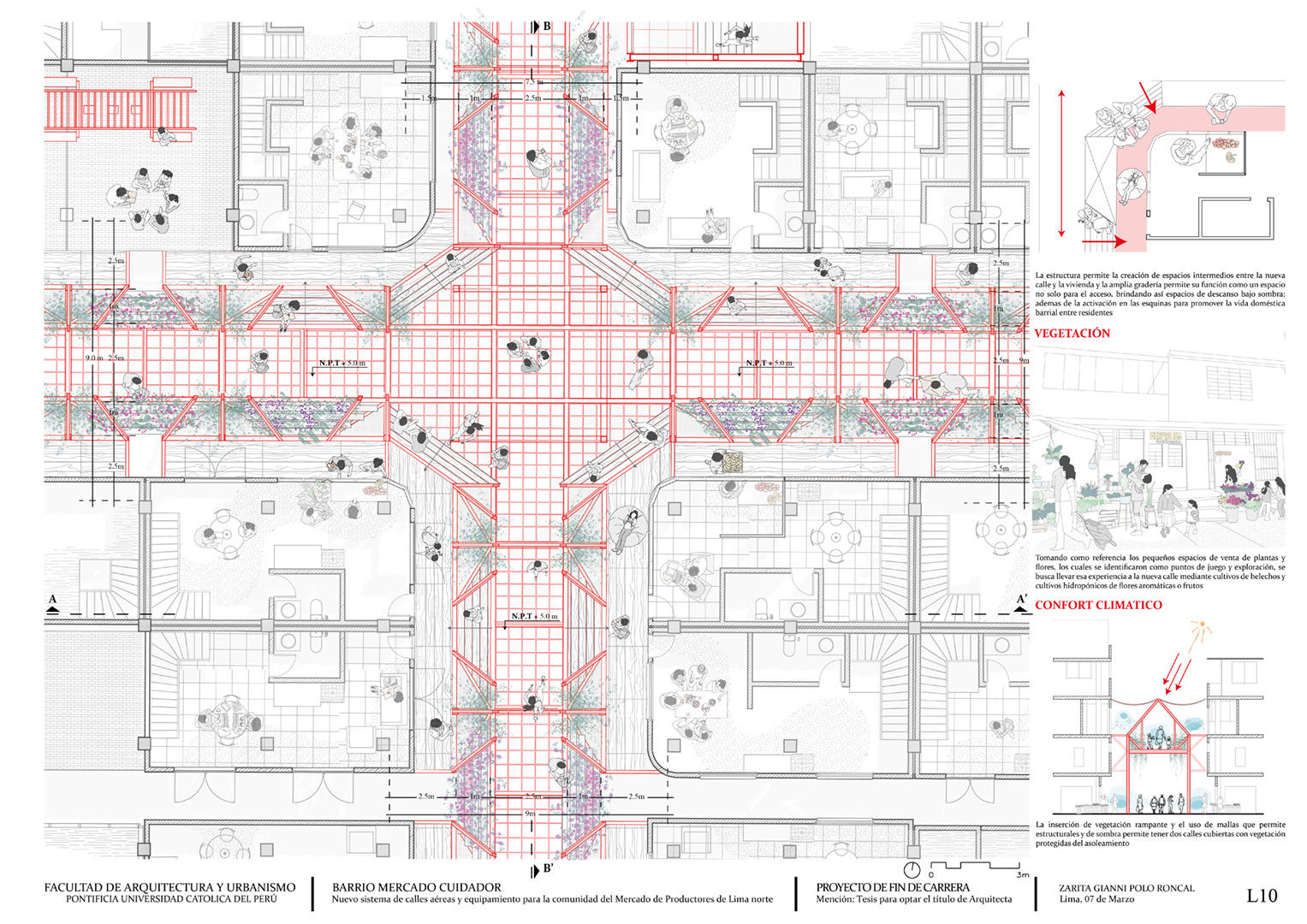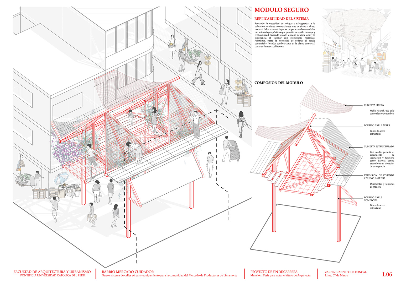 El Mercado Campesino de Lima Norte es un microcosmos de la ciudad autoconstruida; atrae diariamente a unas 2.000 personas y alberga en su recinto un barrio de 800 viviendas autoconstruidas. Este entorno revela problemas críticos: precarias condiciones de habitabilidad y accesibilidad, vulnerabilidad estructural a los terremotos, superposición desordenada de usos y escasez de espacios asistenciales. Esto se ve agravado por el hecho de que el 83% de su población está formada por niños y mujeres, que soportan gran parte de las responsabilidades de cuidado y se enfrentan a riesgos cotidianos.