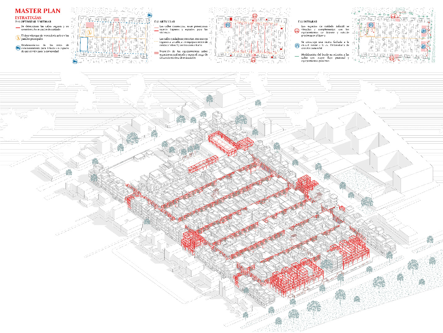 Las calles aéreas seguras se adaptarán a las necesidades de los residentes y a las diversas condiciones de los edificios, proporcionando nuevas entradas a las viviendas, creando espacios intermedios y esquinas activas que fomenten la vida doméstica; además, conectarán con los centros comunitarios, asegurando la continuidad urbana entre el barrio y sus alrededores. El proceso de construcción se basa en el conocimiento local, incorporando la mano de obra de maestros ferreteros y constructores, y transmitiendo prácticas de resiliencia arraigadas en la autogestión del barrio.