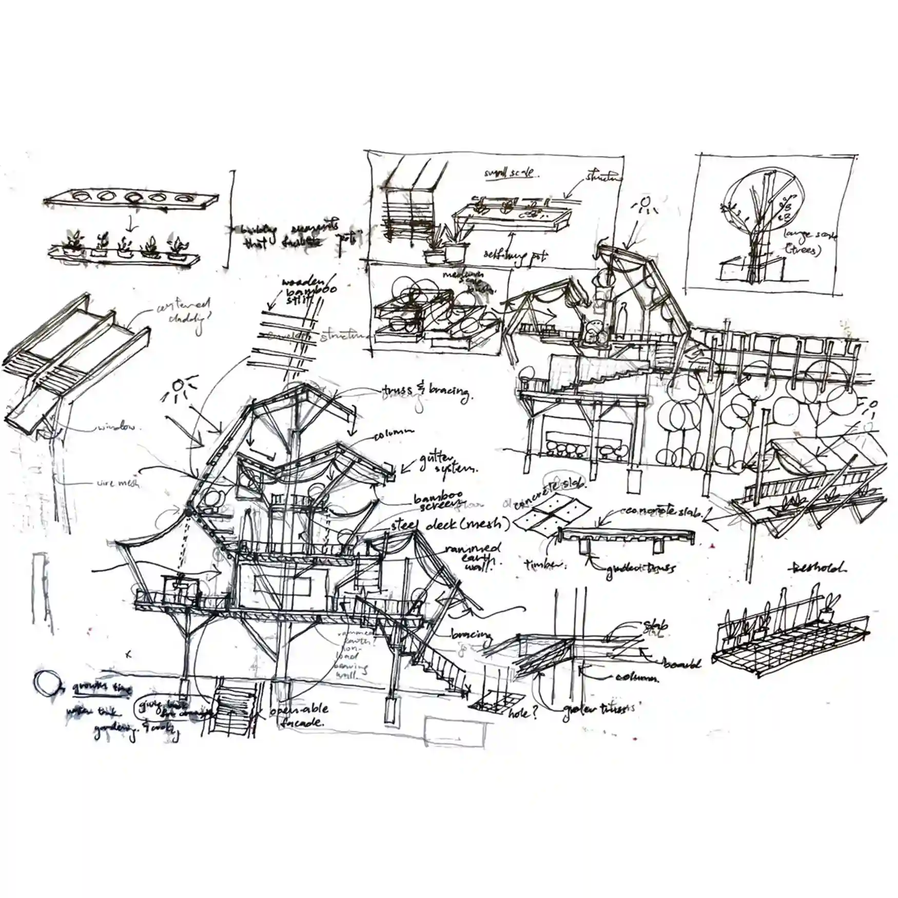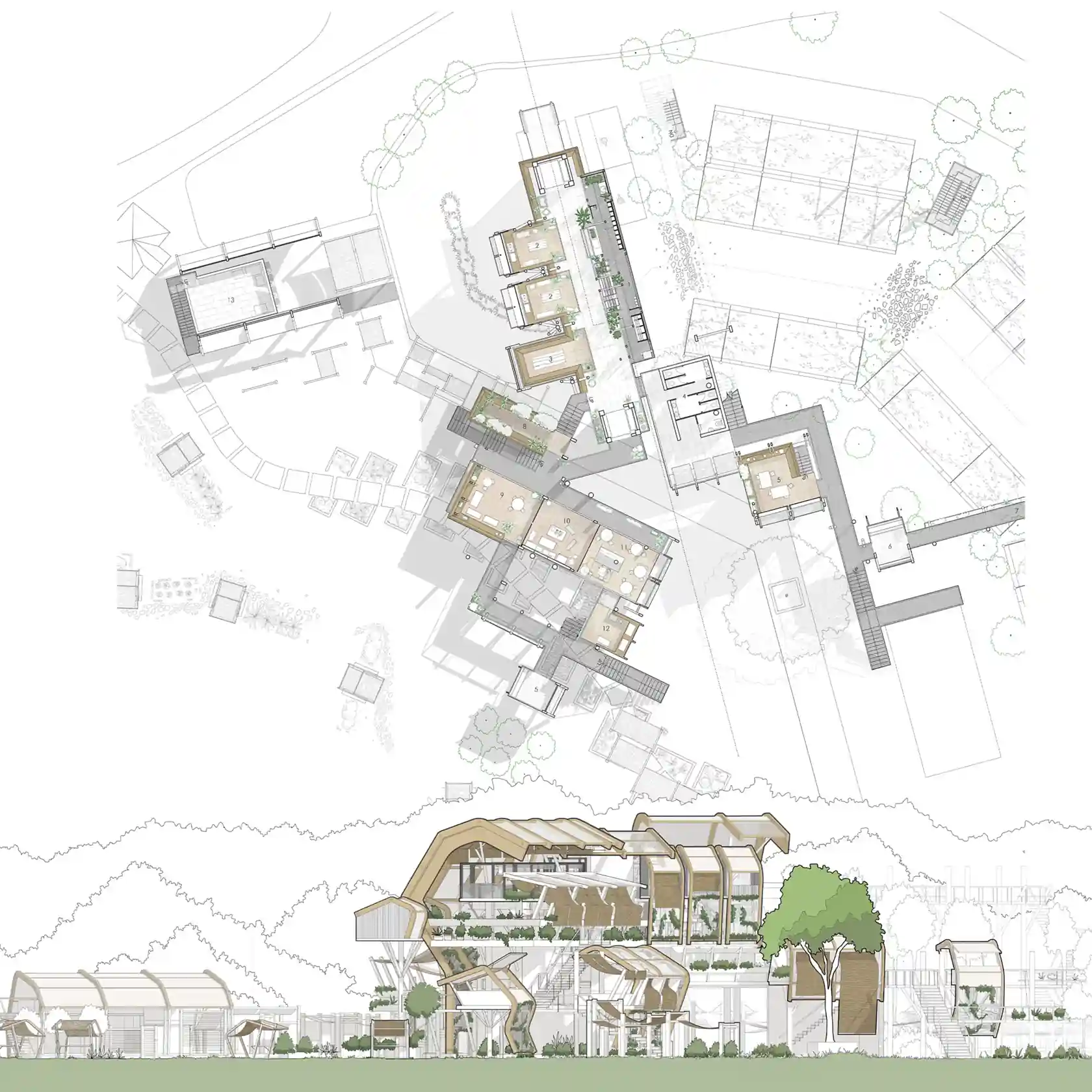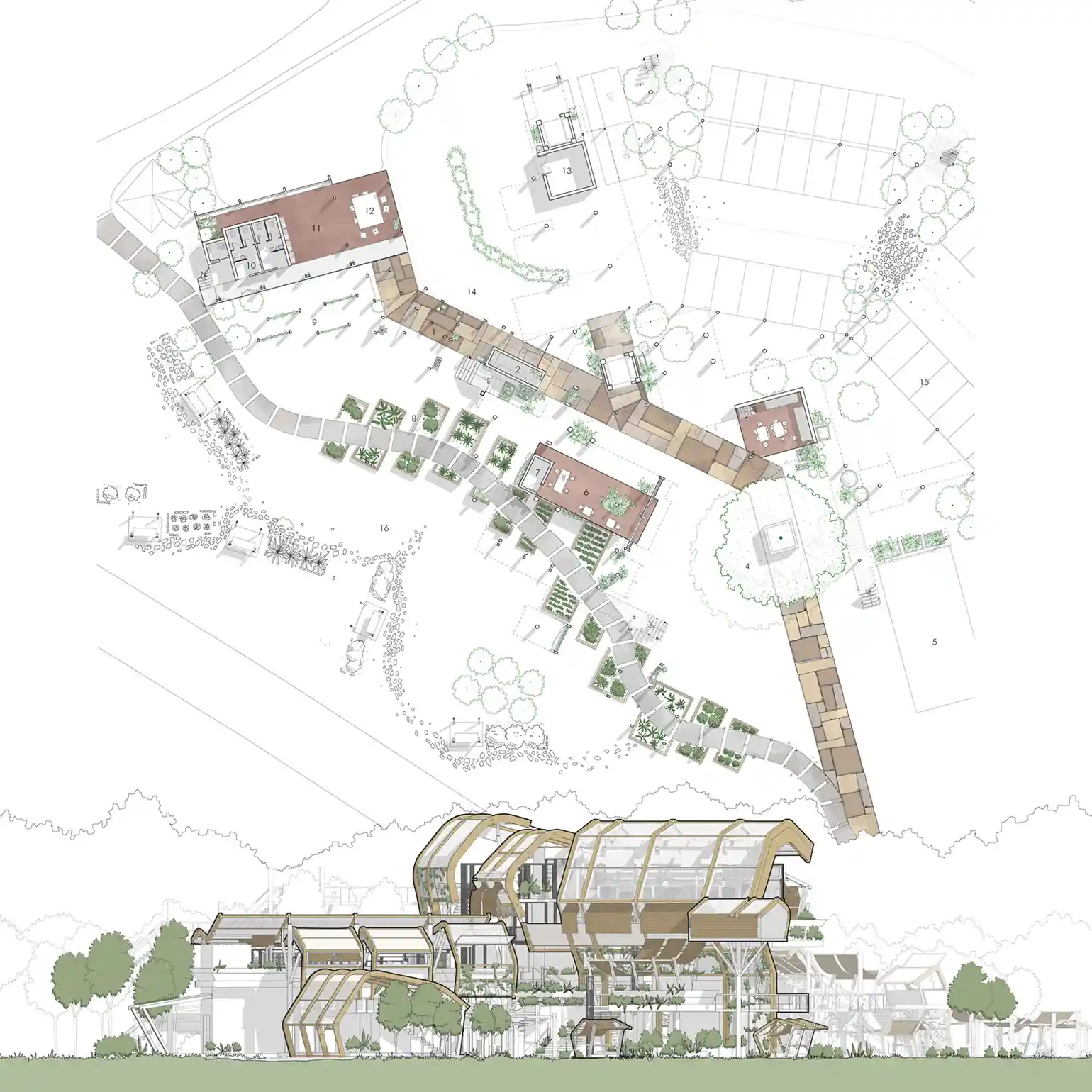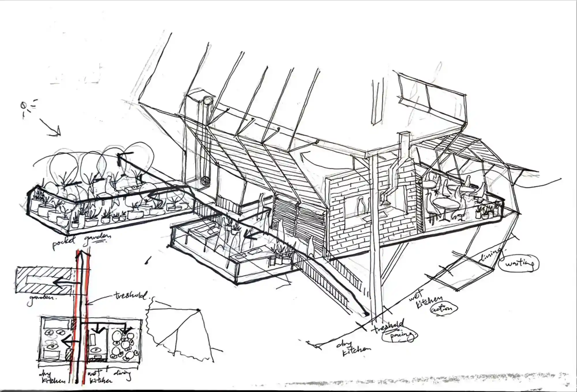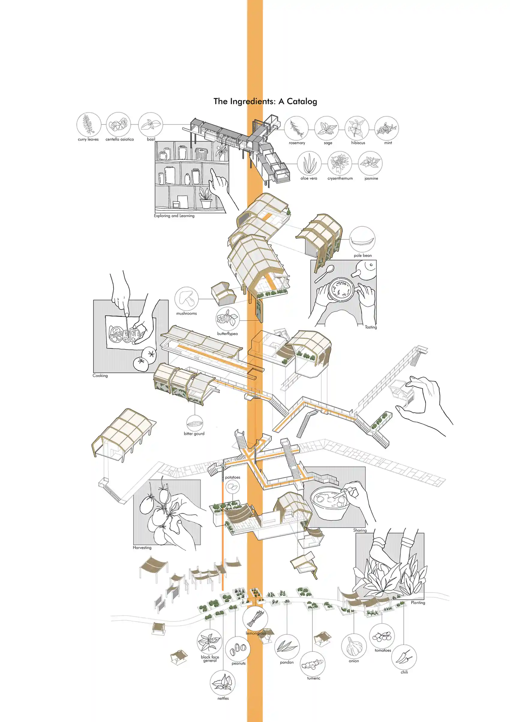 The design expanded from the existing activities of planting, harvesting, cooking, eating, and storing; by exploring/ imagining possible sectional and volumetric relationships between these activities. The self-sustaining program comes from different remedies in which the steps and instructions overlap and intertwine, planting a network of different herbs with community involvement.